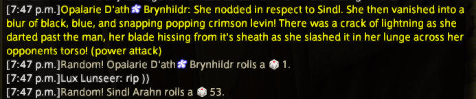 All hits and misses are decided via /random roll. Before the match begins the opponents will /random, and the highest roller will write the first post.